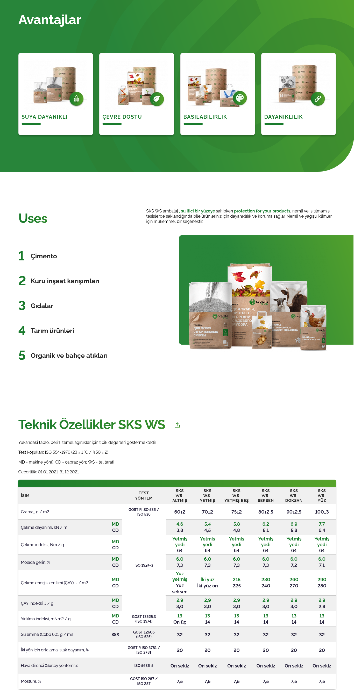 Çimento veya kuru yapı karışımları gibi bazı ürün türleri özellikle neme karşı hassastır. Bu tür ürünler için özel olarak SKS WS suya dayanıklı kağıdı geliştirdik. Nemli ve yağışlı iklimler için mükemmel bir seçenektir